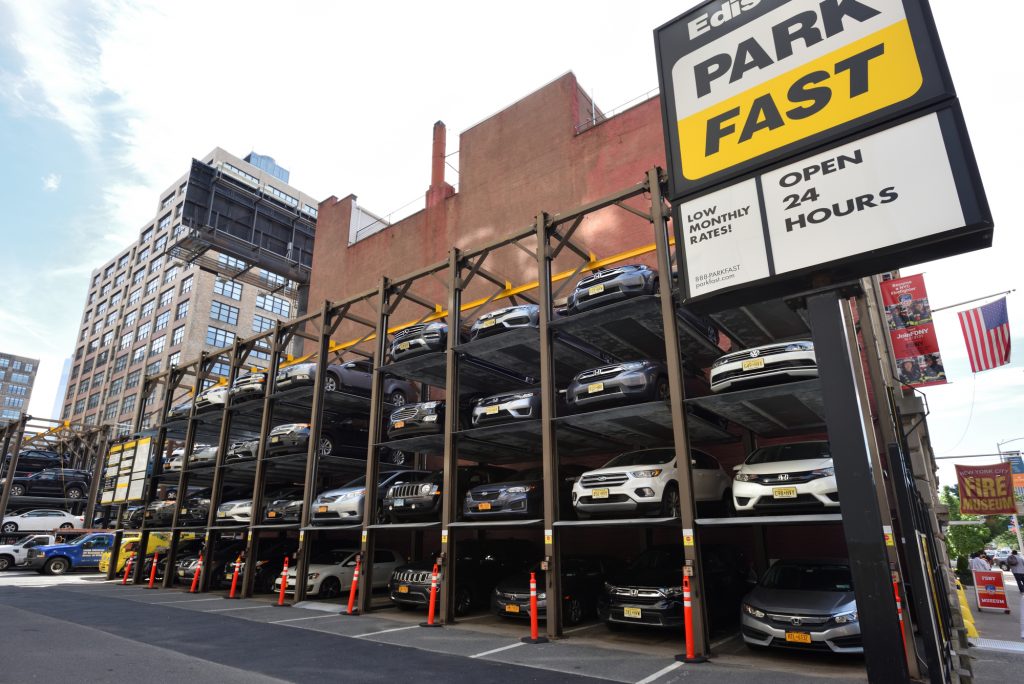 Como uma roda-gigante: o carro entra na rampa inferior e é içado verticalmente. Sem rampas tradicionais, apenas pilhas estreitas e eficientes.